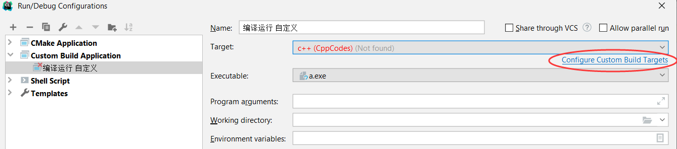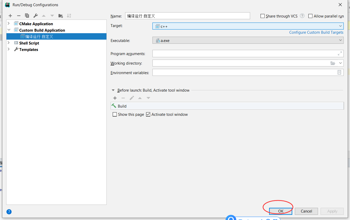 首先选中我们刚才配置的 “编译运行 自定义”, 然后点击绿色三角形运行