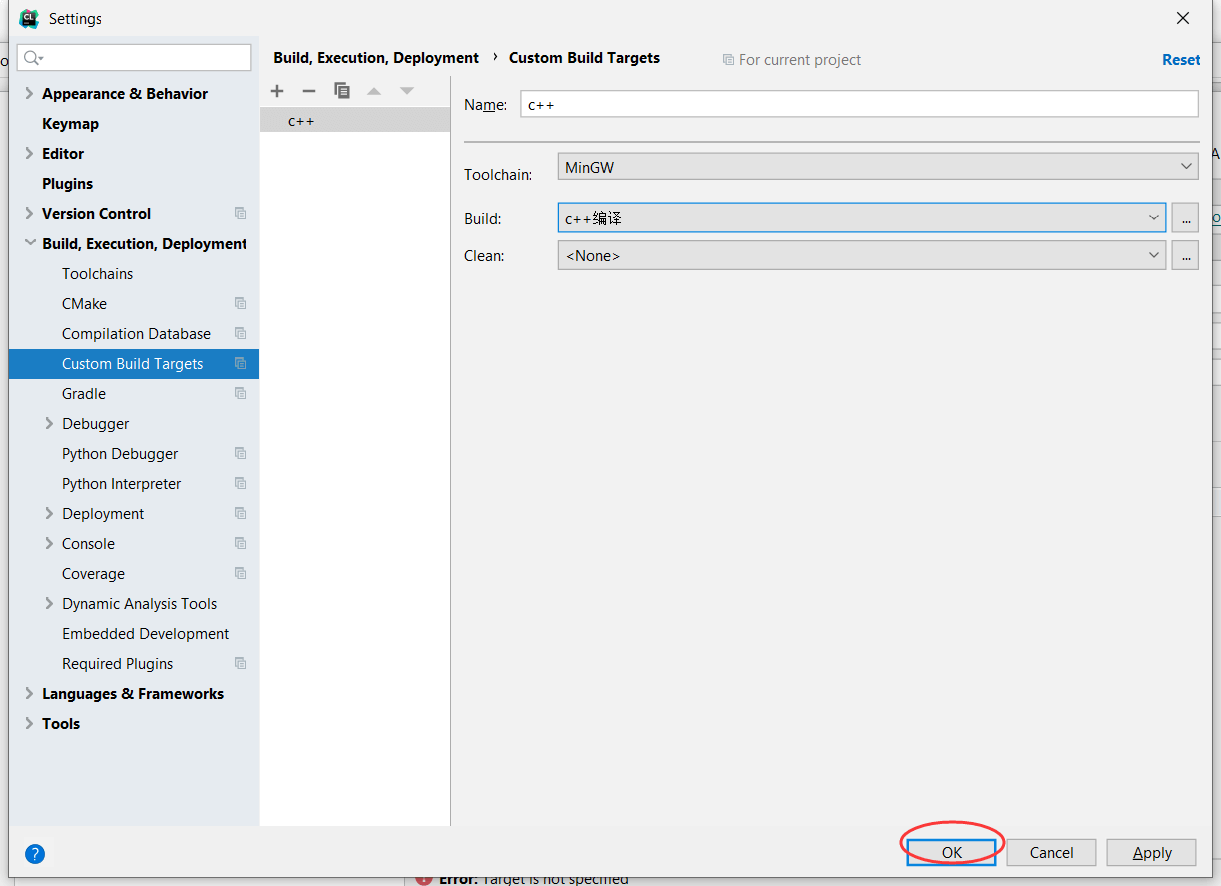 点击+号,右边第一个选MinGW,第二个下拉选择我们之前配置的C++编译,Clean可以不用管