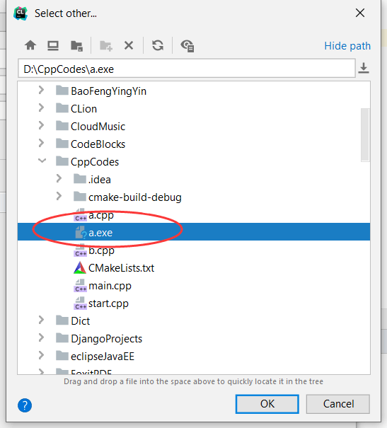 选择工程目录下,刚刚用上面方法生成的a.exe文件