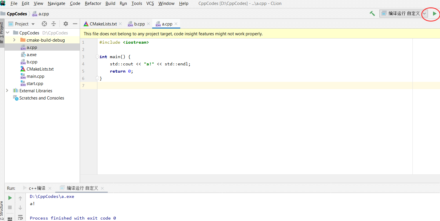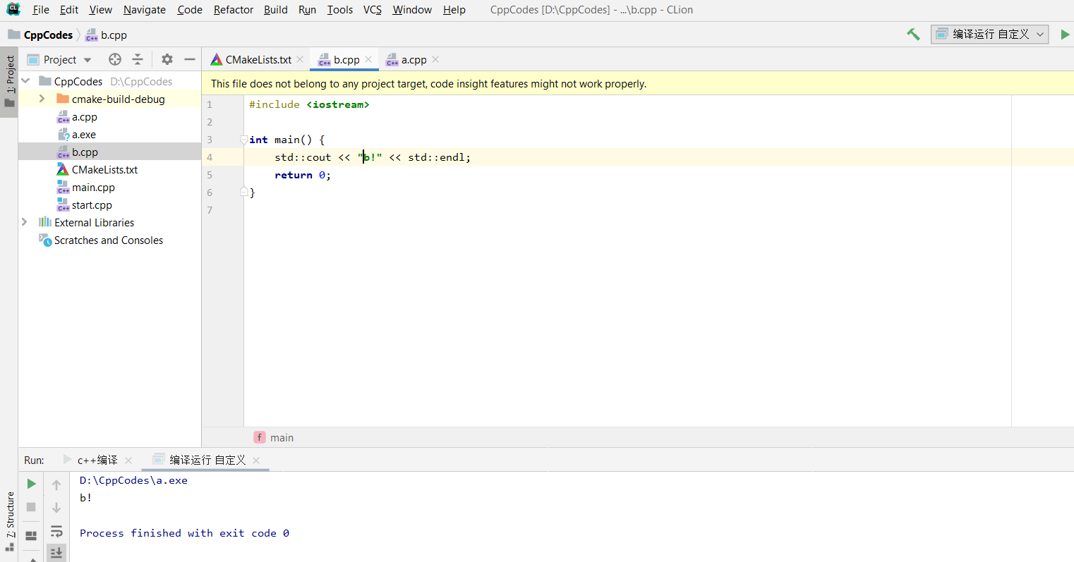 创建一个工程,添加一个c++源文件,命名为a.cpp,写一点打印a!的代码。