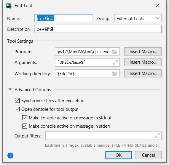 Program里面是你自己mingw中bin文件夹下g++程序的路径,找到自己的就好(如我的是C:\mingw17\MinGW\bin\g++.exe)